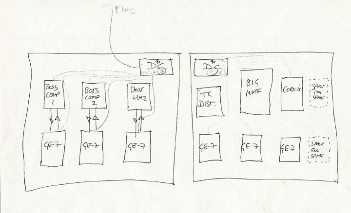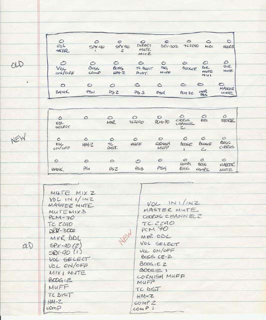 replacement of some "rack" effects with more pedals. (See diagrams). Amps were