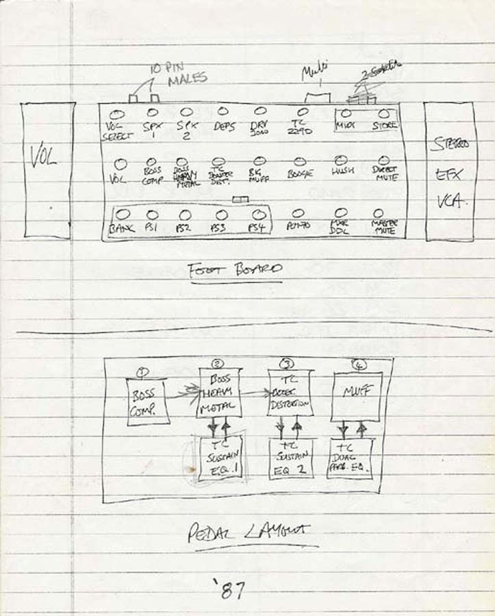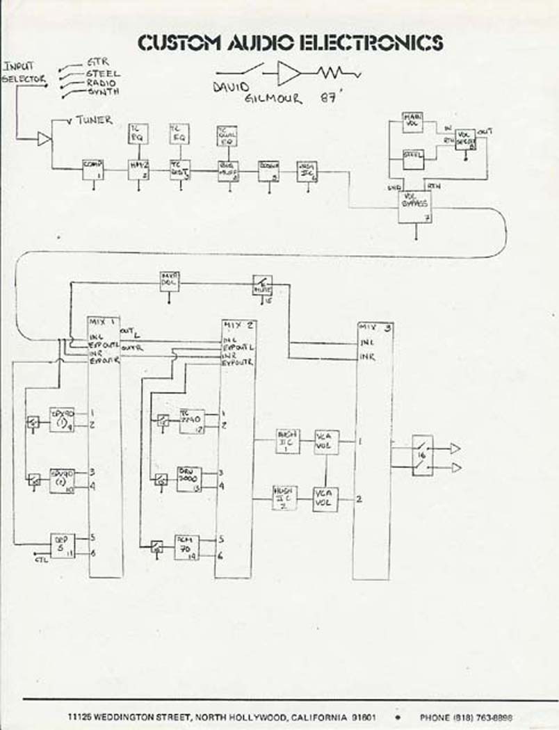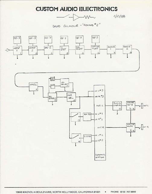 I was fortunate enough to get in contact with Robert Bradshaw of Custom Audio Electronics, who had created an ingenious MIDI foot control board for use with Pink Floyd's Momentary Lapse of Reason touring rig. Below is a brief Q & A with Mr. Bradshaw followed by some amazing schematics and pictures furnished by Mr. Bradshaw: